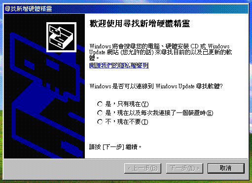 將實驗板連結上電腦,WinXP會出現尋找新增硬體精靈,選[不,現在不要],再按[下一步] |