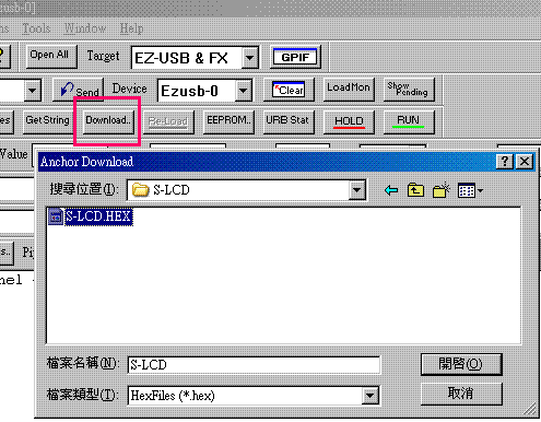 準備下載程式到實驗板上的RAM做測試,按[Download],選取光碟上的範例.完整路徑如下 |