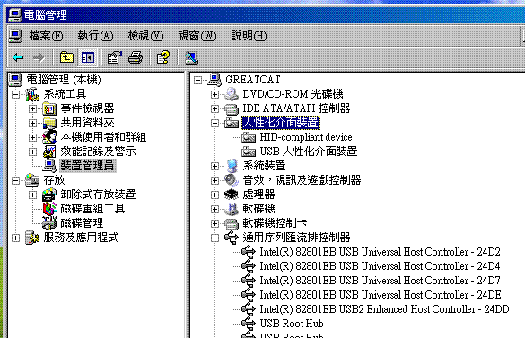 程式下載完成後,實驗板會自動Reset,裝置管理員會出現一個[人性化介面裝置]類別,以及其下的兩個項目. |